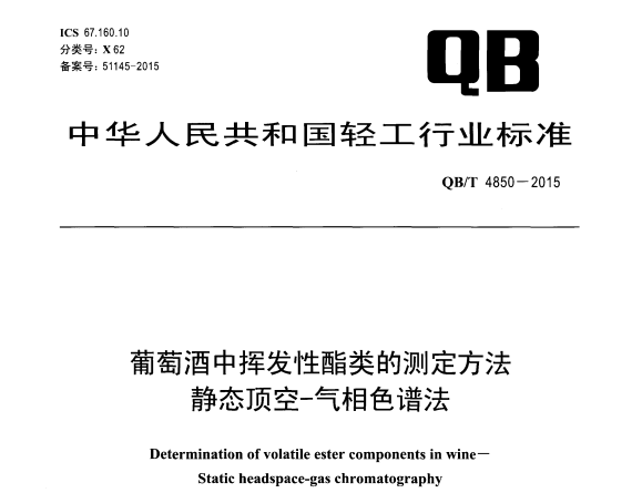 QBT 4850-2015 葡萄酒中揮發(fā)性酯類的測定方法 靜態(tài)頂空-氣相色譜法 適用范圍本標準規(guī)定了葡萄酒中揮發(fā)性酯類的靜態(tài)頂空-氣相色譜法的原理、試劑和材料、儀器和設備、分析步驟... 更新日期:2020-05-09 下載包(1)