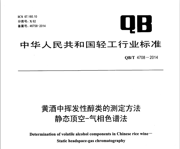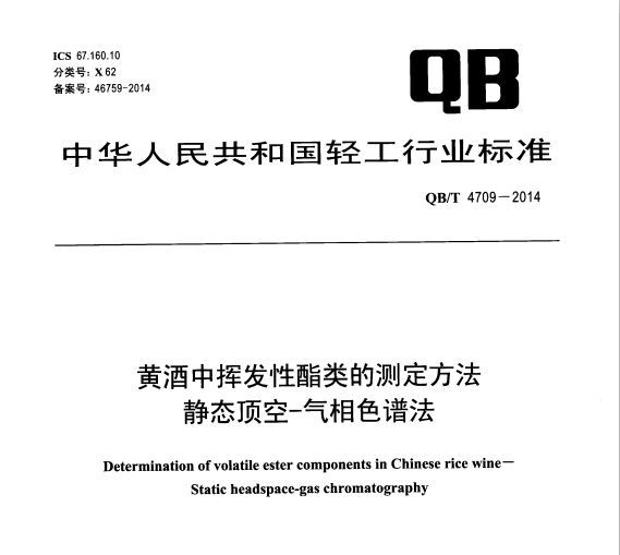 QBT 4709-2014 黃酒中揮發(fā)性酯類的測定方法 靜態(tài)頂空-氣相色譜法 QB/T4709-2014黃酒中揮發(fā)性酯類的測定方法靜態(tài)頂空-氣相色譜法 本標準規(guī)定了黃酒中揮發(fā)性... 更新日期:2020-05-09 下載包(1)